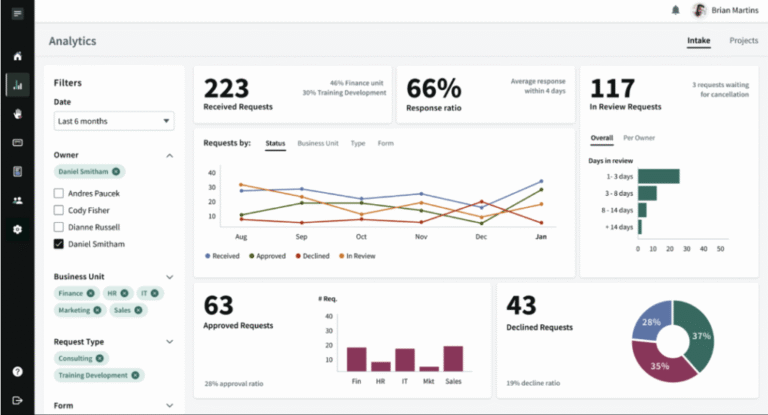 You need a platform that connects training initiatives to business outcomes. Look for built-in analytics that track request volume by business unit, project delivery timelines, resource allocation, and program costs in real time.