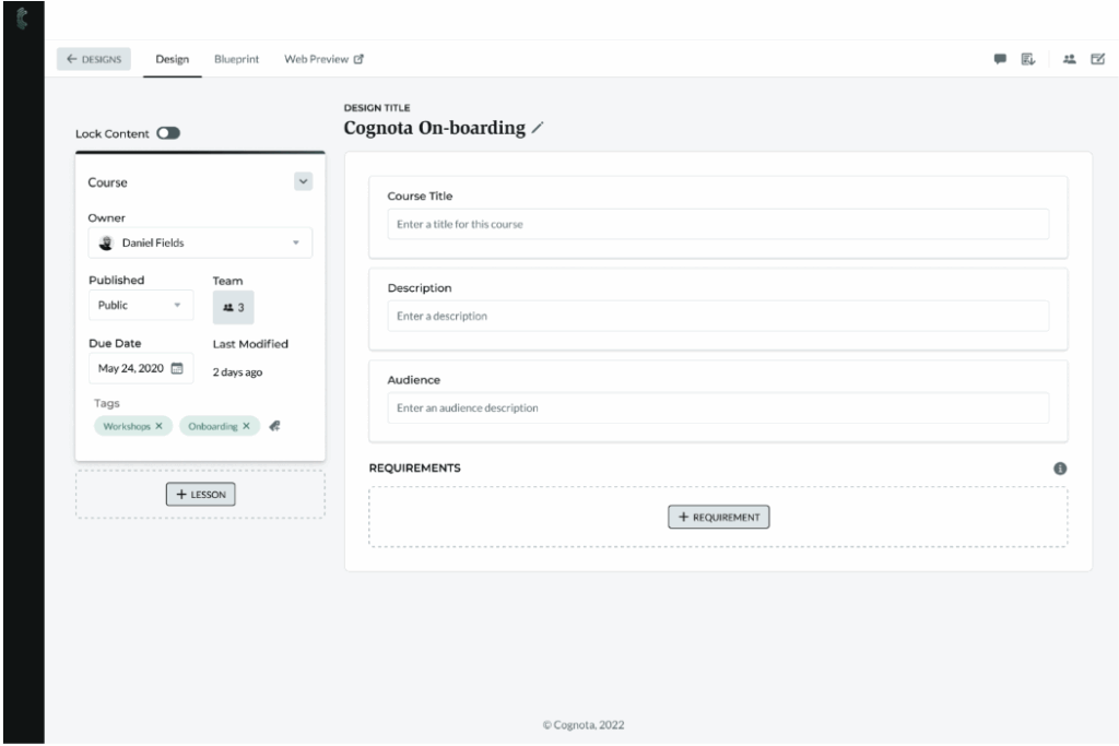 Business users and external collaborators can submit requests, review content, and track project status. SMEs can review training content using blueprint view (full course outline) or web preview (learner-facing view) directly in Cognota. All project files, designs, and discussions stay in one place, which eliminates version control chaos across email threads and shared drives.