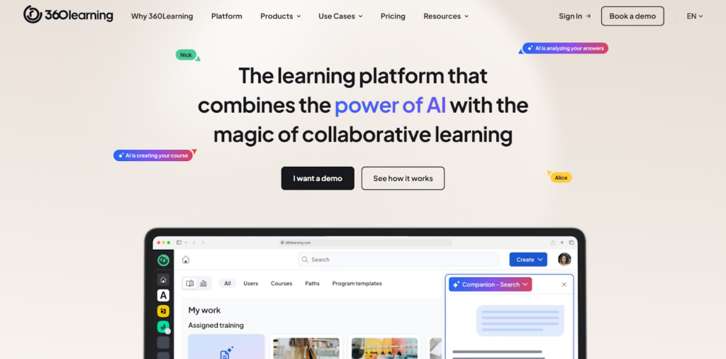 360Learning | Organizations leveraging peer-driven collaborative learning | Employee onboarding, compliance, and upskilling through peer knowledge | Collaborative authoring with peer feedback, AI course builder, and automated compliance training |