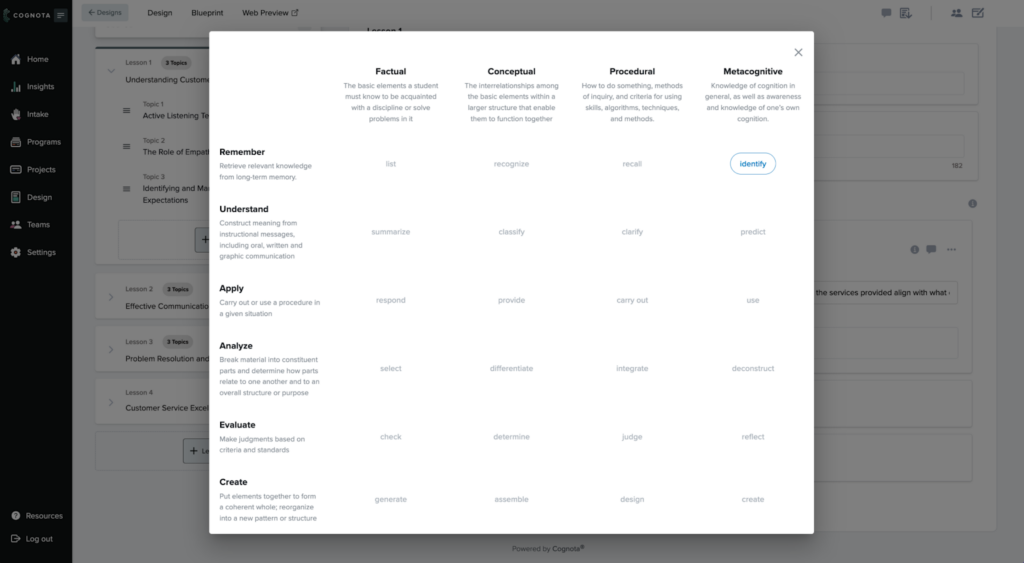 - Learning objectives guidance: Use the built-in Bloom’s Taxonomy verb picker to write clear, action-oriented learning objectives instead of vague terms.