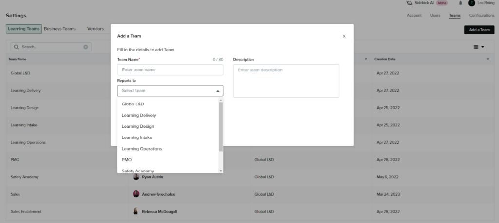- Learning team users: Main L&D team members