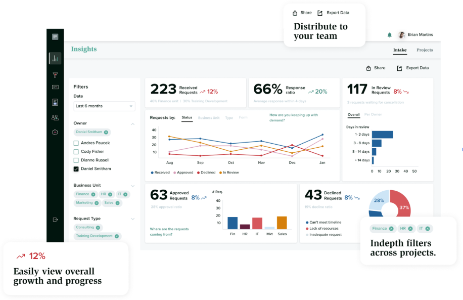You can filter each component to track how many requests are in review, which projects are at risk, where the team is overloaded, and how work is distributed across business units.