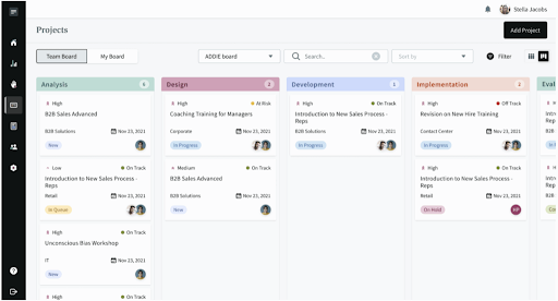 Each project goes through a defined L&D workflow with stages, tasks, owners, due dates, and health indicators visible in one board view. Teams and leaders can see the status of every active project at a glance without chasing updates.