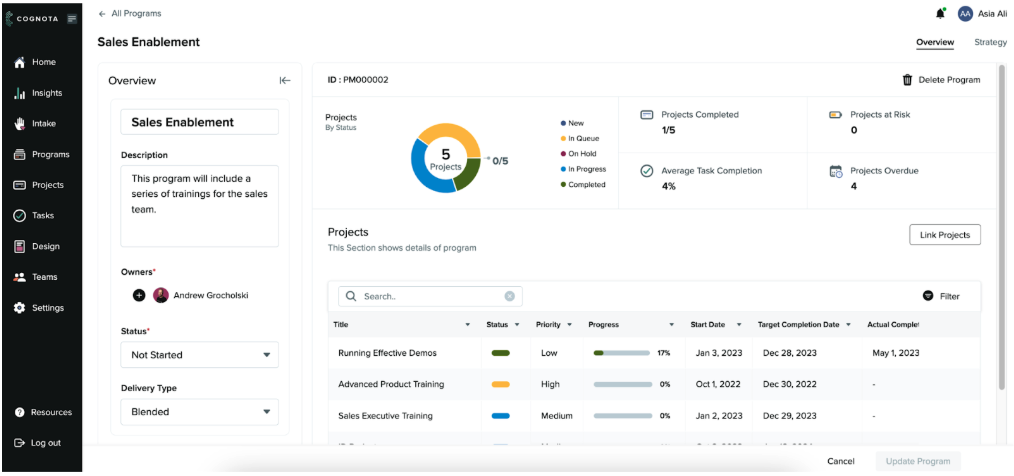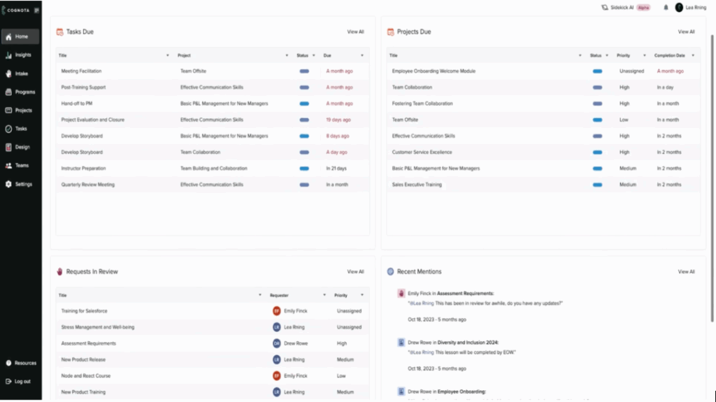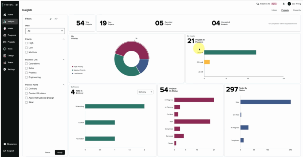 Cognota connects demand, project status, capacity, programs, and analytics in one place. L&D managers can see what is in review, what is at risk, where the team is overloaded, and how work aligns to key initiatives.