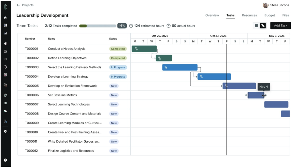 For example, before a leadership development steering meeting, an L&D manager opens the Gantt view for that program. They see two content tasks slipping past the target go-live date and one dependency that blocks assessment design. They adjust dates, capture the updated chart, and walk stakeholders through the impact and recovery plan.