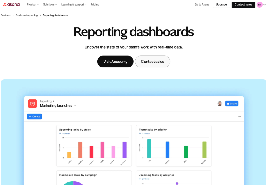 Its strength for L&D analytics lies in portfolio dashboards that roll up project status, workload views that show team capacity, and custom reporting across multiple programs. Because Asana isn’t purpose-built for learning operations, teams need to configure custom fields, workflows, and reports to make it work for L&D-specific use cases like intake prioritization or training demand forecasting.