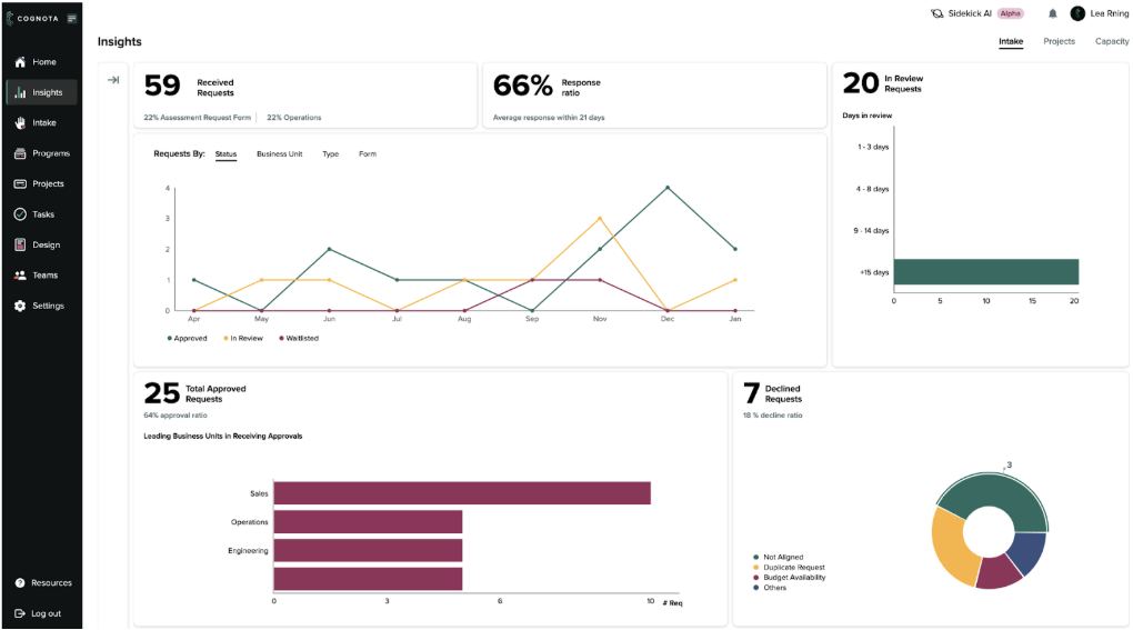 - Find patterns in requests, approvals, and decline reasons to guide intake and prioritization