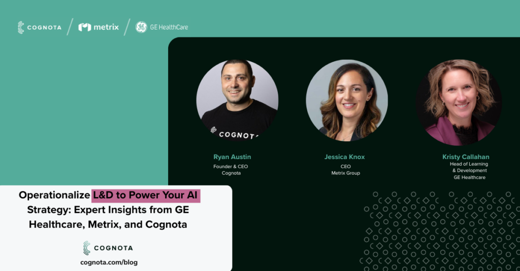 In our recent expert webinar, industry leaders from GE Healthcare, Metrix, and Cognota shared battle-tested strategies for operationalizing L&D to unlock AI’s true potential. Here’s what they learned and what you need to know.