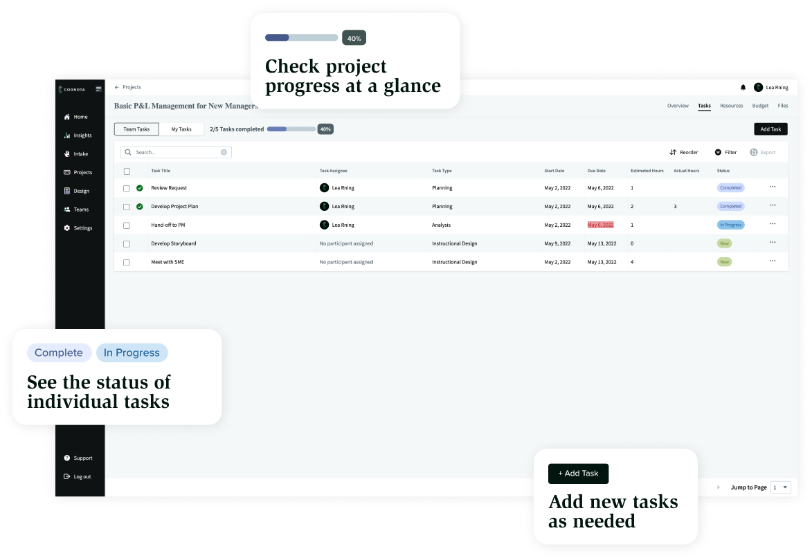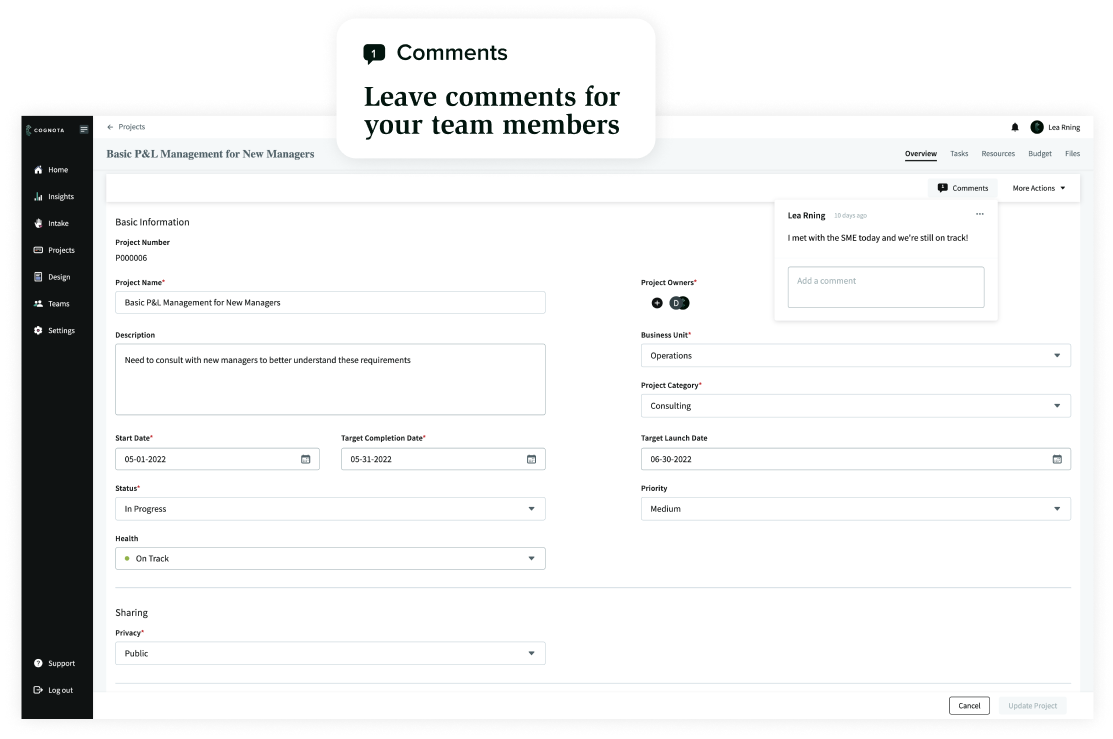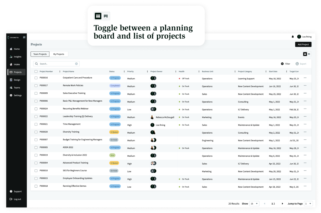 On the project board, there’s a button to toggle back-and-forth between a view of your projects and your team’s projects. You can also use filters to see who owns, and is contributing to, training projects.